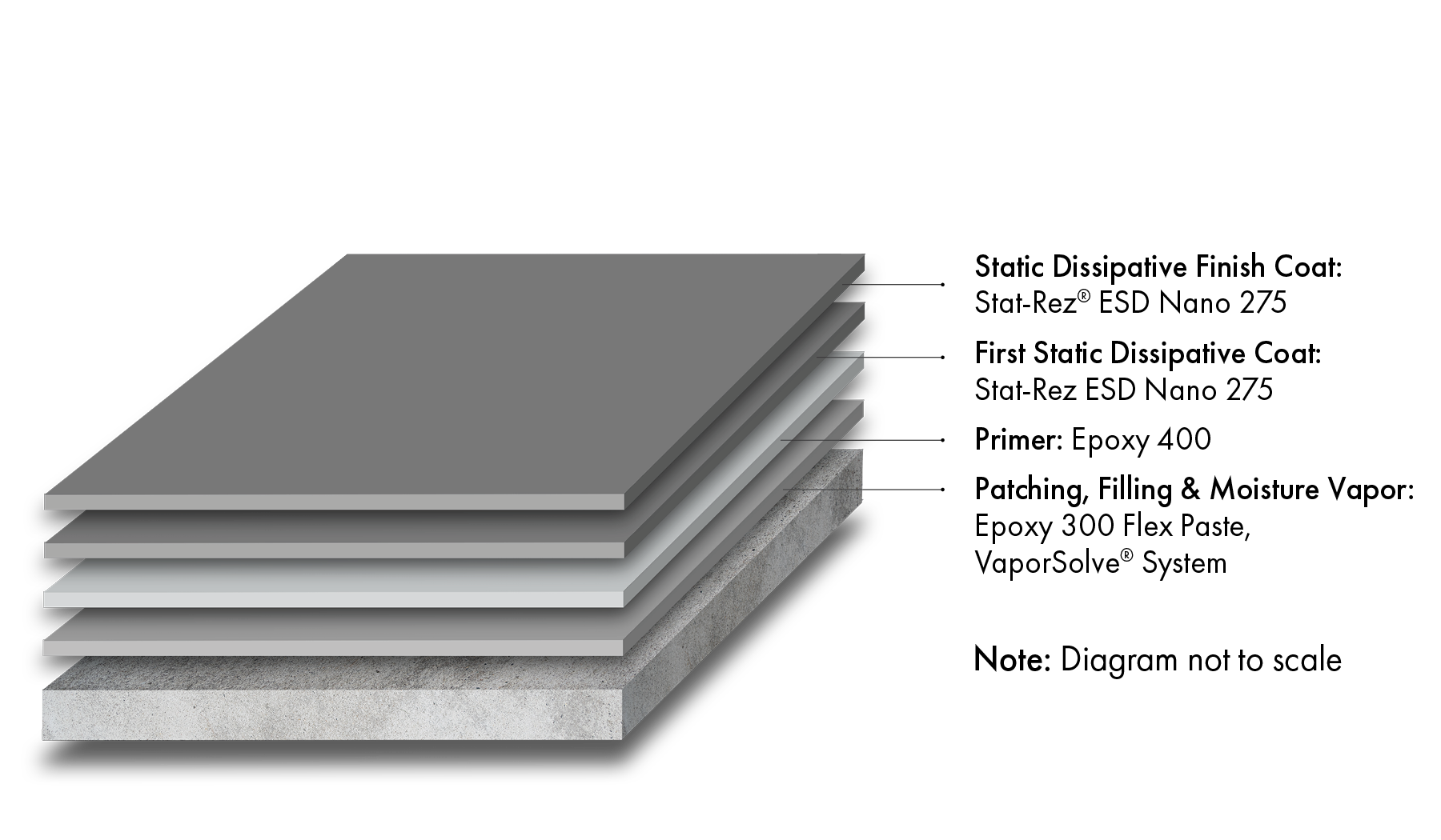 APF STAT-REZ ESD NANO 275 STATIC DISSIPATIVE is a three-layer, high performance electrostatic dissipative aliphatic polyurethane flooring system consisting of a low viscosity epoxy primer, STAT-REZ ESD NANO 275 finish coat. The STAT-REZ ESD NANO 275 STATIC DISSIPATIVE system is engineered to be installed at 12-16 mil thickness. This system provides a very durable, wear-resistant, electrostatic dissipative surface that provides reduction of electrostatic charges when used in conjunction with SD compliant footwear.