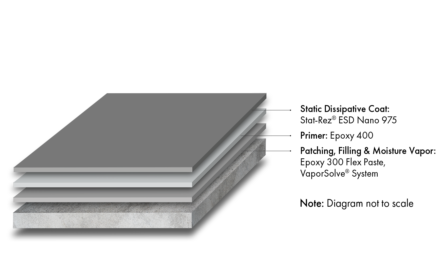 APF STAT-REZ ESD NANO 975 STATIC DISSIPATIVE is a two-layer, high performance electrostatic dissipative epoxy flooring system consisting of a low viscosity epoxy primer, APF STAT-REZ 975 ESD NANOfinish coat. The STAT-REZ ESD NANO 975 STATIC DISSIPATIVE system is engineered to be installed at 24-28 mils dry film thickness. This system provides a very durable, wear-resistant, electrostatic dissipative surface that provides reduction of electrostatic charges when used in conjunction with static dissipative compliant footwear.